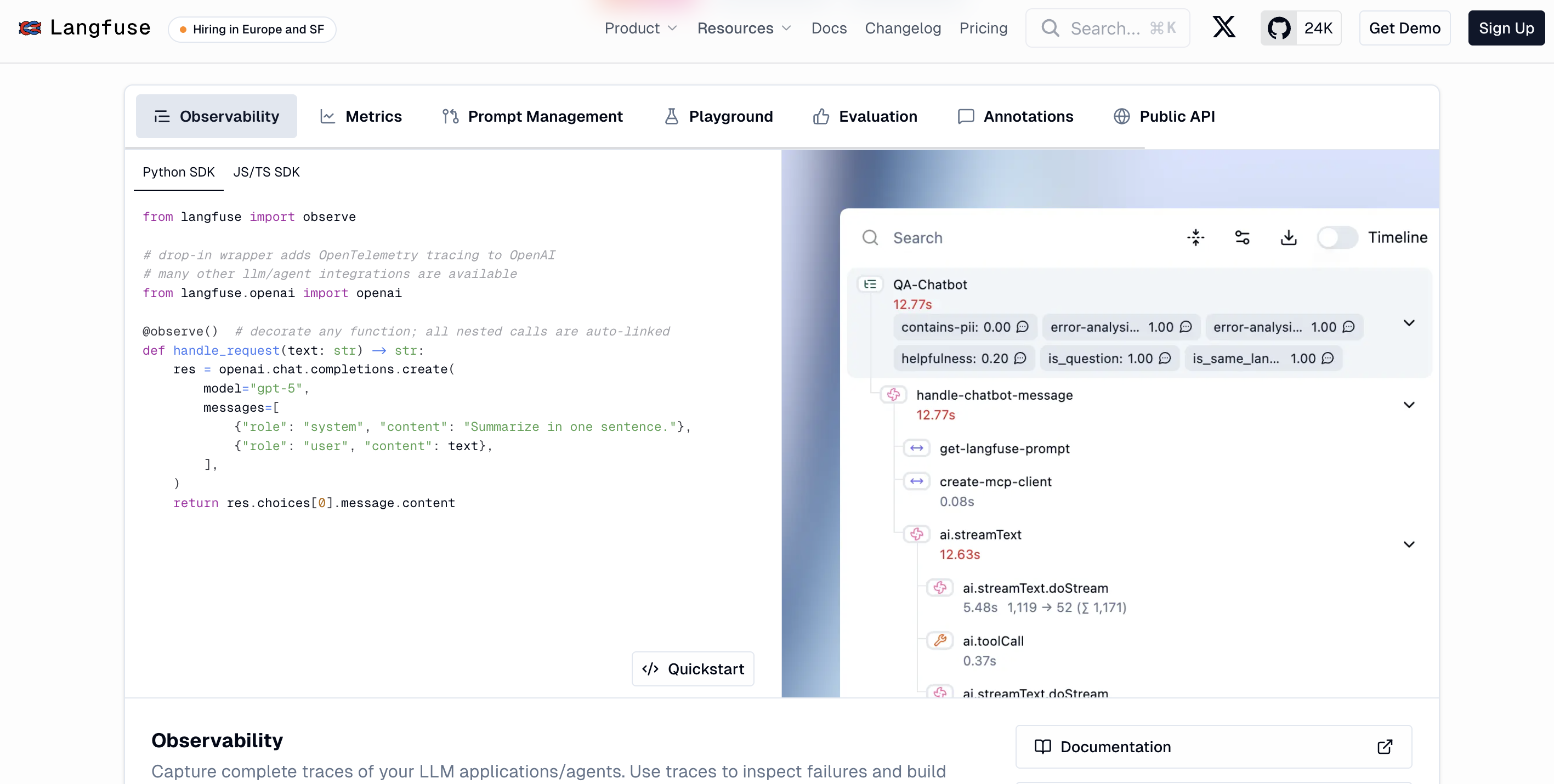 Langfuse is an open-source LLM engineering platform with observability, evaluation, and annotation capabilities. You can self-host it without restrictions under an MIT license. The platform covers tracing, prompt management, and human annotation. If you need full data control and won't compromise on open source, Langfuse is the strongest option in this category.