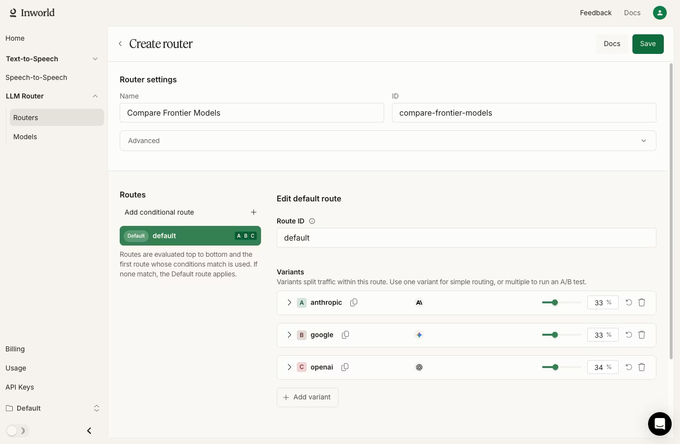 | Inworld Router | Free during Research Preview | Teams building voice-enabled AI applications that need LLM routing combined with text-to-speech in one request pipeline | Conditional routing, traffic splitting, sticky user assignment, combined LLM + TTS pipeline, OpenAI and Anthropic SDK compatibility |