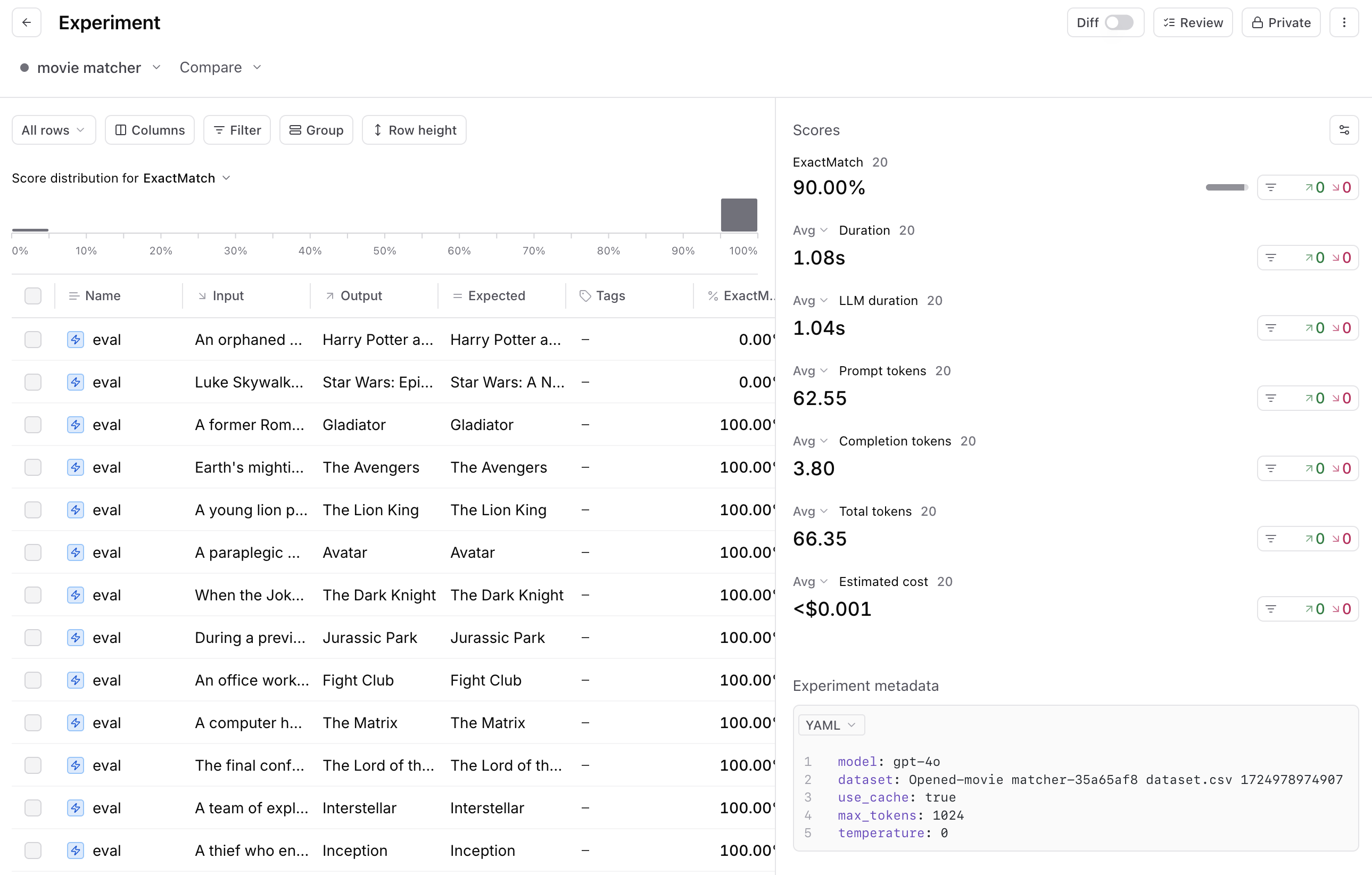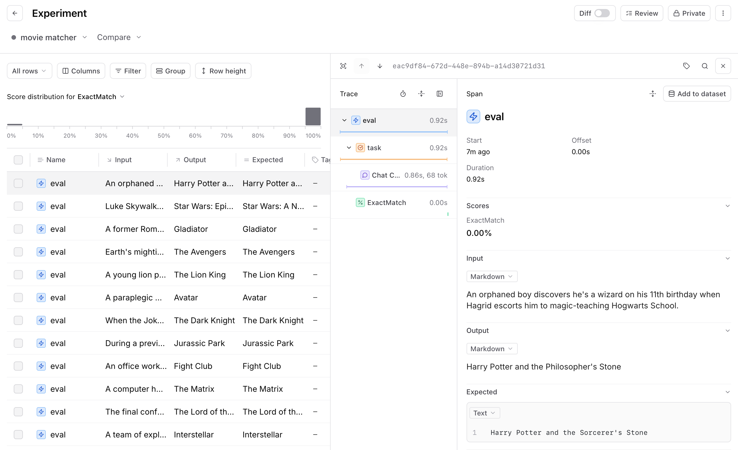 To figure out where to focus first, start by reviewing 5-10 actual examples from your evals. For each row, inspect the trace–the input, output, and how your evaluation function scored the output.
